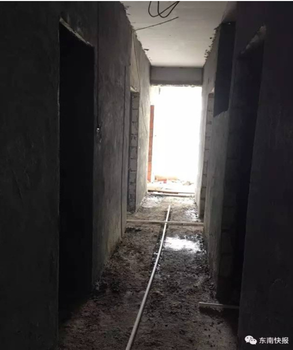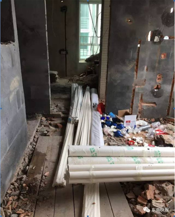 在現(xiàn)場,記者并未找到施工人員和房東。只見802室的客廳、廚房地面確實挖出深10厘米的溝渠,過道邊還放著許多管道和水龍頭以及裝修材料。