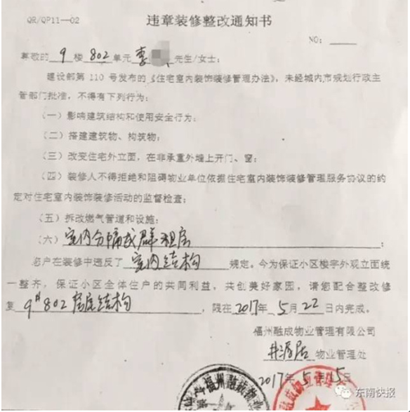 物業(yè):已下發(fā)違規(guī)裝修通知書并上報相關(guān)部門